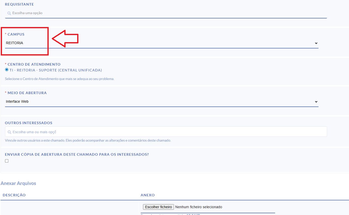 8º Preencher o chamado com a descrição, e interessado caso tenha outros interessados, colocar como campo CAMPUS A REITORIA