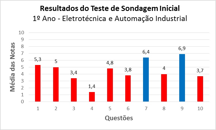Na realidade escolar nota-se que a maioria dos estudantes possui muita dificuldade nos conhecimentos básicos de Matemática relativos ao Ensino Fundamental, o que gera um entrave para a aprendizagem dos conceitos de Matemática do Ensino Médio. A fim de sondar os conhecimentos básicos de Matemática dos alunos do 1º ano dos Cursos Técnicos em Automação Industrial e em Eletrotécnica do IFMG – campus Ipatinga, foi aplicado, no início do ano letivo, o Teste de Sondagem Inicial composto por dez questões, cada uma valendo 10 pontos, as quais abordam conteúdos dos eixos Números e Operações, Álgebra, Grandezas e Medidas, Geometria e Estatística. A média das notas dos alunos nesta sondagem inicial foi de 44,7%, ou seja, não alcançaram o mínimo necessário (60%), como mostram os dados no gráfico abaixo. Esses resultados apontam que há grande defasagem nos conteúdos de Matemática do Ensino Fundamental. Isso implica que os alunos, em sua maioria, não têm uma base consolidada para cursar a Matemática do Ensino Médio.