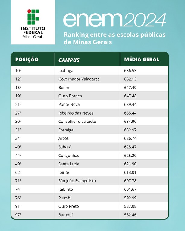 Veja o ranking dos campi do IFMG nas escolas públicas de Minas Gerais: